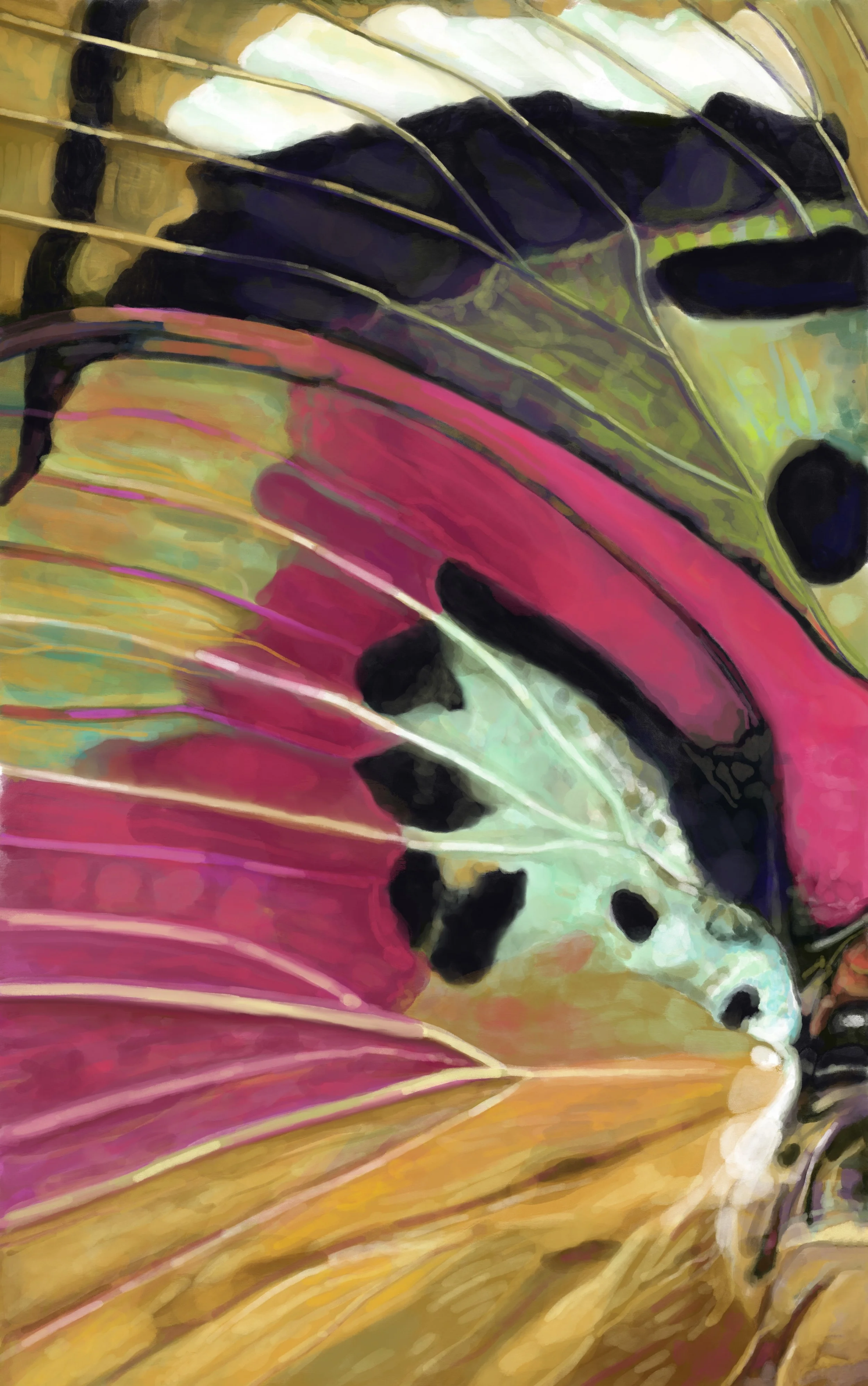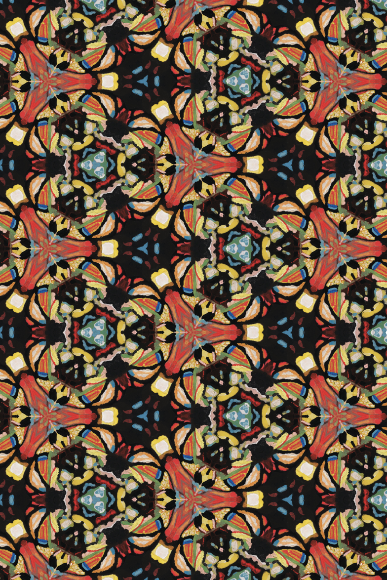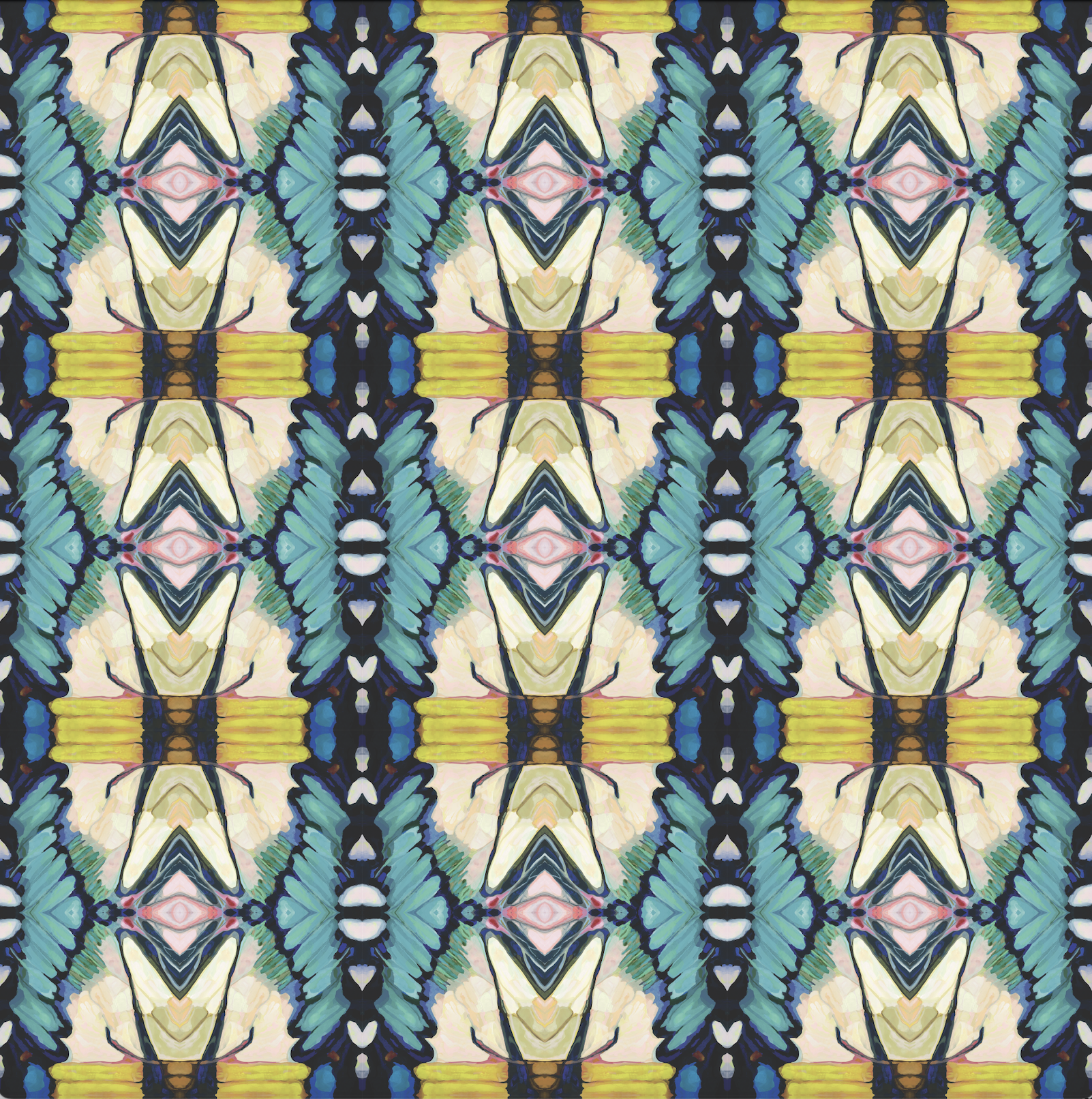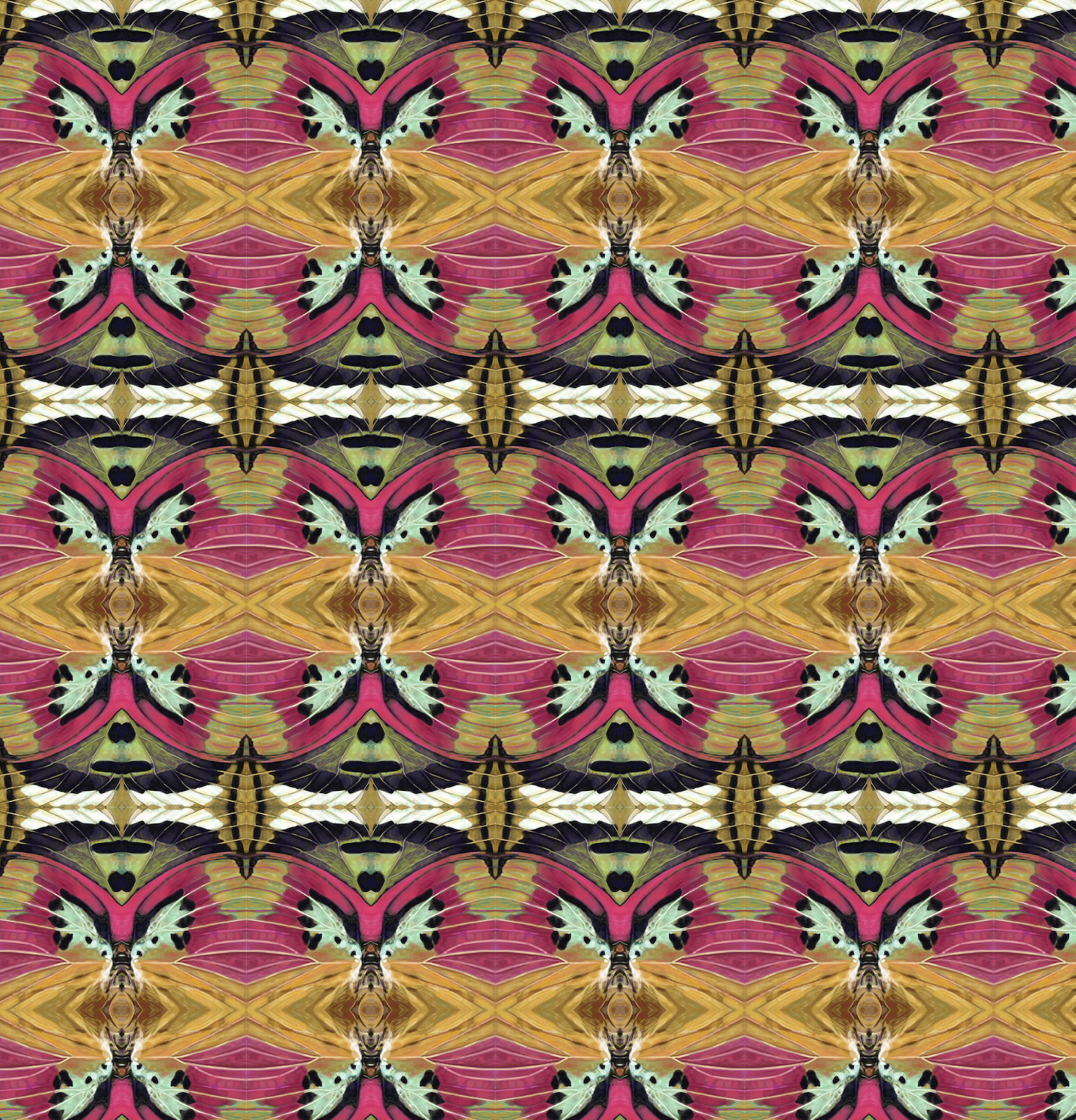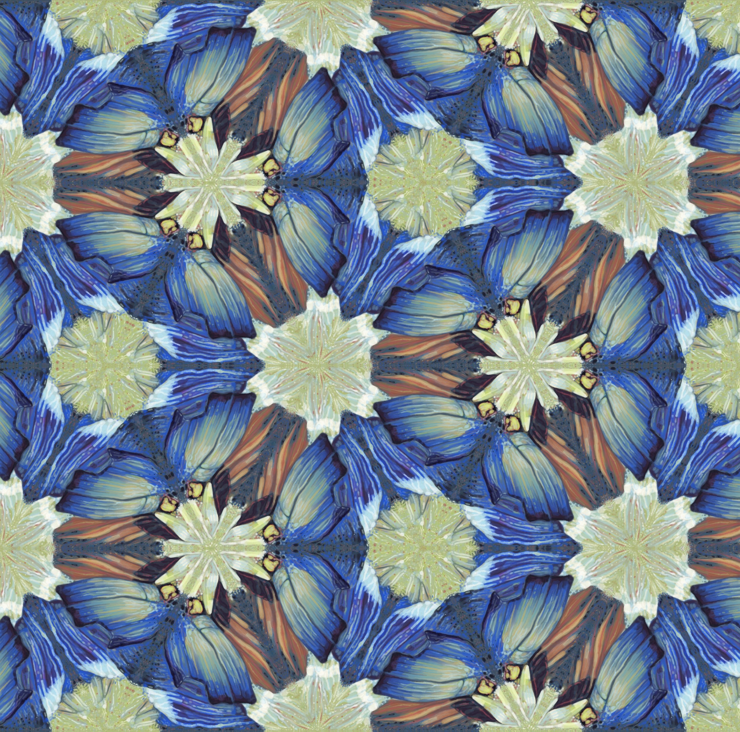 Planner repeat patterns generated by reflecting and rotating details of butterfly wing paintings. The prints include rectangular grid and hexagonal grid repeats.