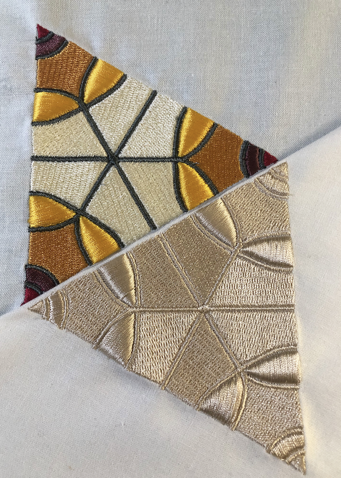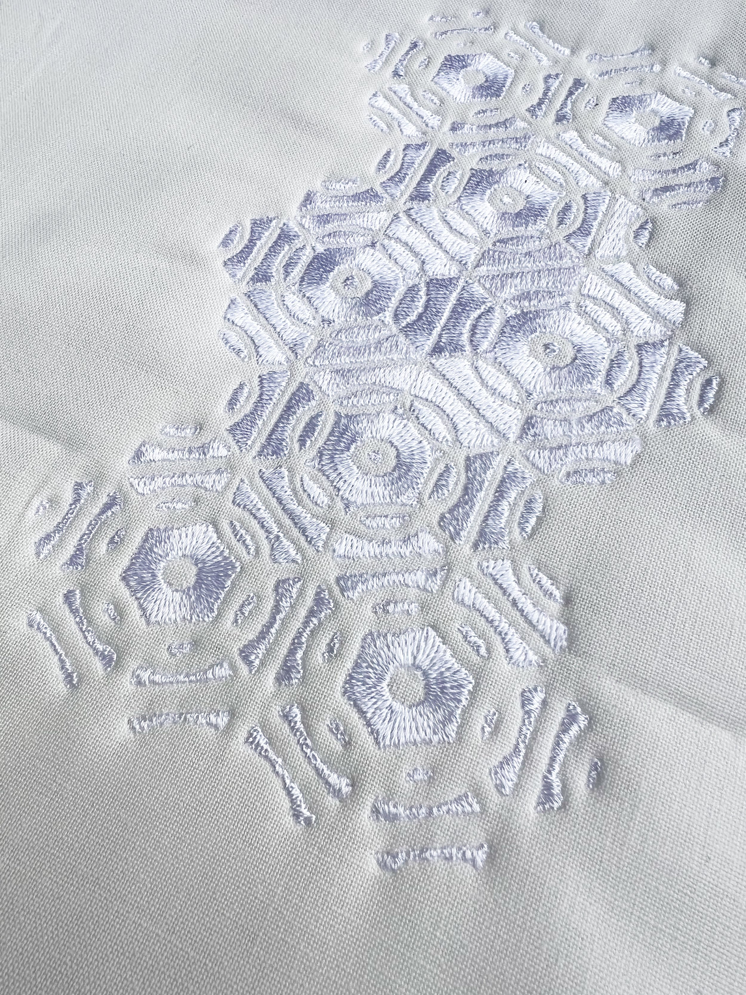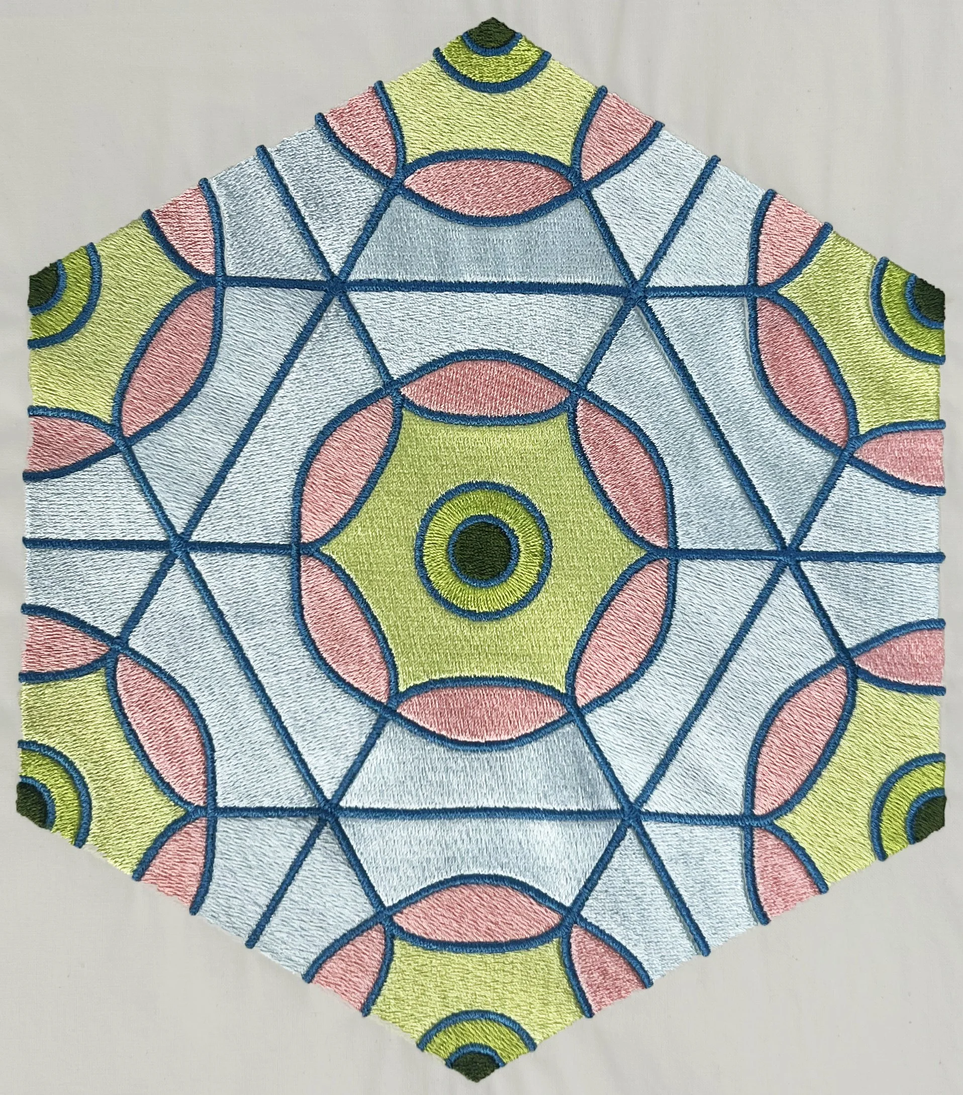 The studies below explore machine embroidery applied to designs from the Response Patterns graphic library. Explorations consider density and height of fully filled embroidery stitches and hexagonal tiling.