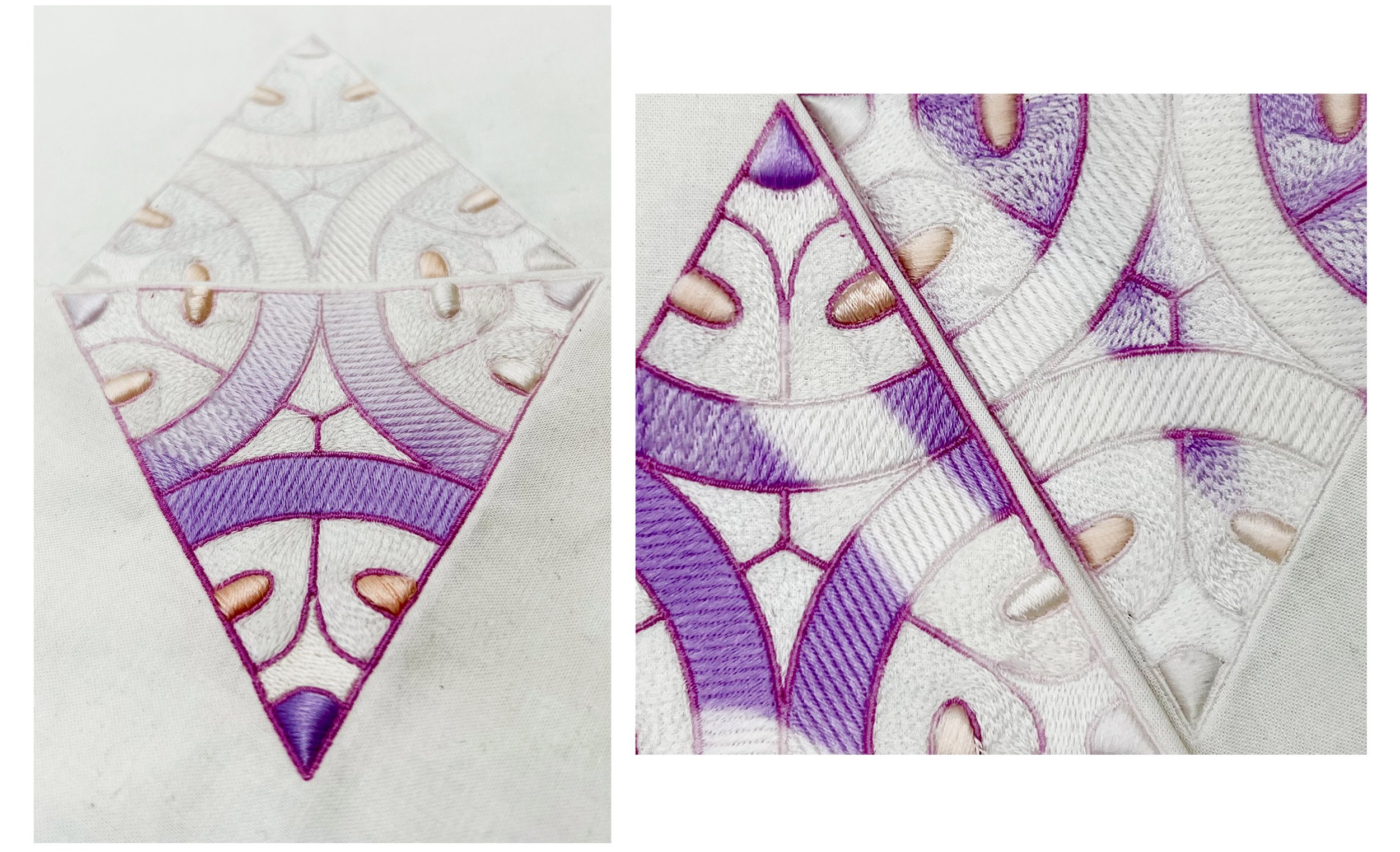 The studies below explore machine embroidery with UV reactive thread, applied to designs from the Response Patterns graphic library.
